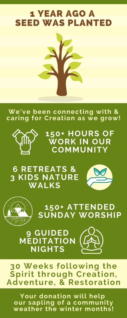 A sure sign of Spring is increased activity and we’re living into that here at Church in the Wild! Check out our events page for all that’s going on and join our mailing list so you don’t miss updates on future events. In addition to what you’ll find on the events page, we’re planning volunteer work days with VINES and Sky Lake in April & May as well as our FIRST WORSHIP SERVICES at the end of May/beginning of June!