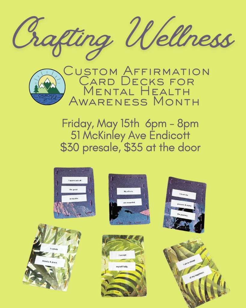 May is Mental Health Awareness Month so we’re coming together to craft some wellness! Create your own custom card deck of positive affirmations. Join Broome Creative ReUse for an evening of creating, community, food, and fun! All craft supplies and charcuterie provided